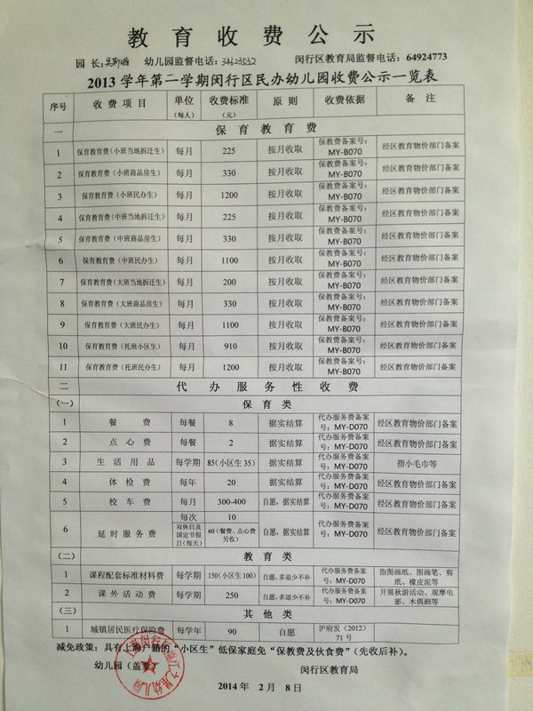 1、严格按上级主管部门(教育局、物价局)审核批准的项目收费,收费前必先公示(全日制、代办费、开学收费)。公示栏设置在幼儿园醒目位置,并做到长期公示,便于家长查看。收费后及时出具电子发票。服务性的代办项目按照自愿原则。 2、凡是收取的所有费用(如幼儿代办费、伙食费、各类保险费、以及管理费等),一律做到专款专用,不得挪作它用,并于当日存入银行。 3、为幼儿代办的项目,经幼儿园讨论后备案,并公示且征求家长意愿,以家长签字为准。 4、保育教育费按月收取,不得跨月预收。幼儿在园天数按照法定工作日计。实际在园天数累计不足当月法定工作日一半的,按照半月收取;达到或超过当月法定工作日一半的,按照一个月收取。整月不来园的,不收取保育教育费。